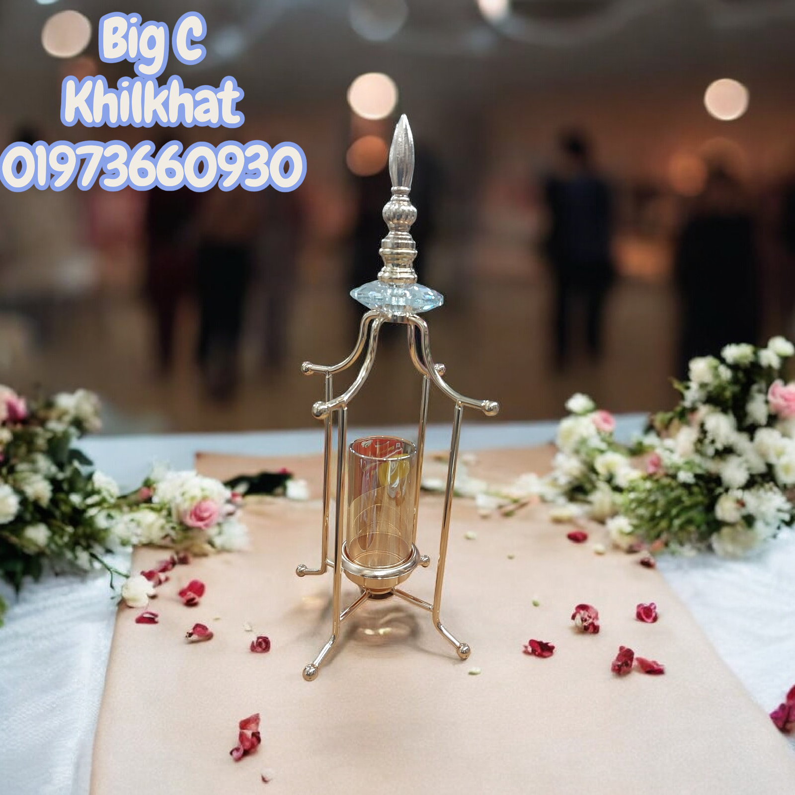 A tall, slender gold structure that resembles an open-air lantern or pagoda. It has a tripod-style frame that curves upwards to meet at a central point, topped with a crystal accent and a pointed metal finial. Suspended in the center is a cylindrical glass cup (tinted amber/gold) to hold a candle. A sophisticated candle holder or centerpiece. Its height and open frame design allow it to hold a candle without blocking visibility across a dinner table, making it ideal for wedding reception tables or dining decor.