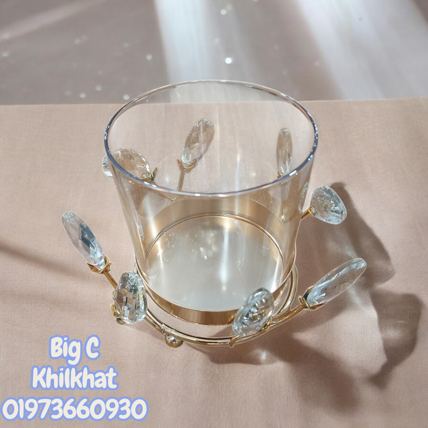 A sophisticated candle holder featuring a clear glass cylinder (hurricane glass) perched on a slender, polished gold stem and a domed base. The base of the glass cup is surrounded by gold wire "branches" adorned with large, faceted crystal leaves or gems that catch the light. This is a stemmed version of the previous crystal vine holder. Its added height makes it perfect as a dining table centerpiece or a mantel accent, designed to hold pillar or votive candles.