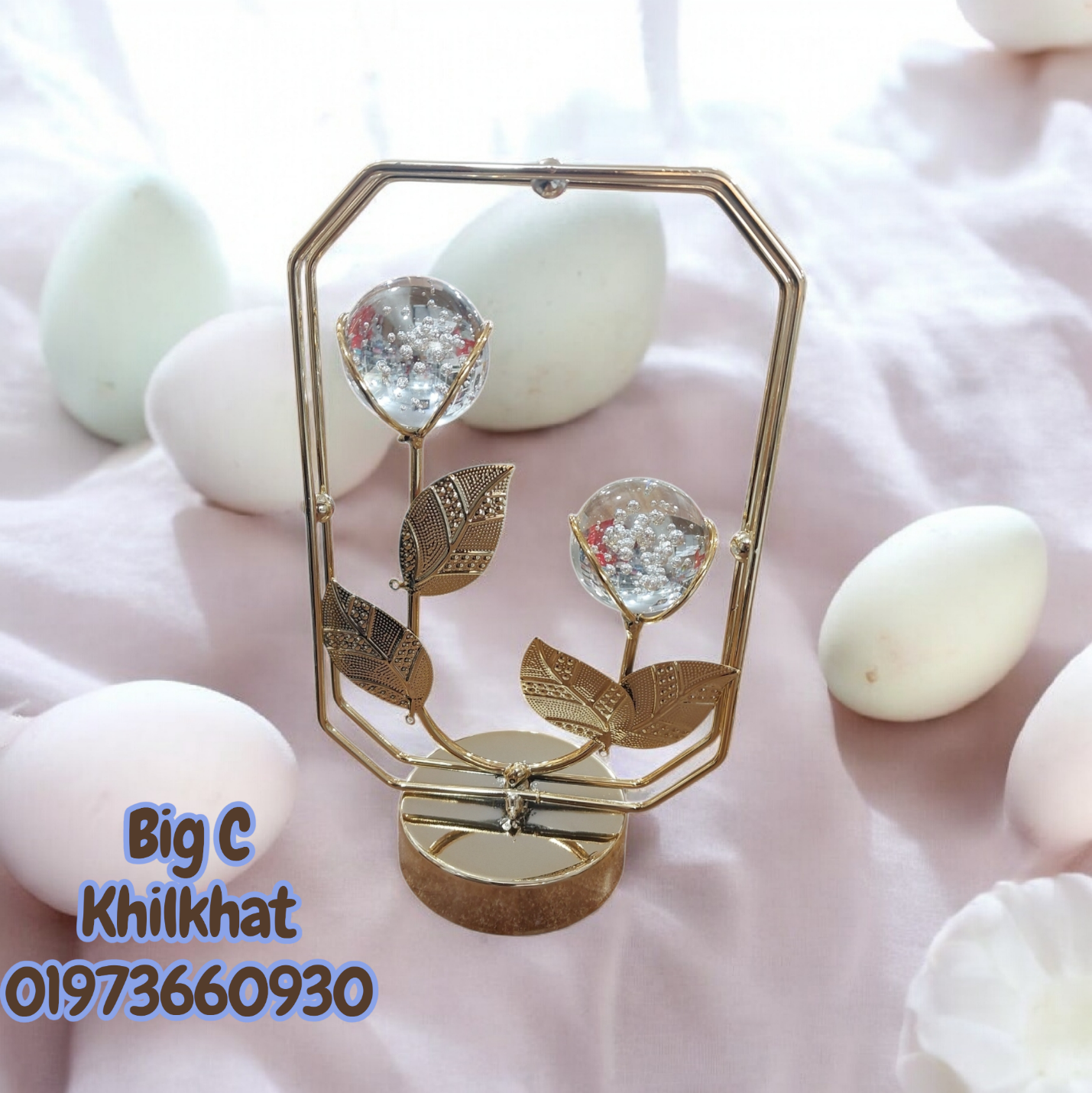 This piece features a much more elaborate, baroque-style gold pedestal base compared to the modern geometric bases of the previous items. It supports a central crystal ball containing bubbles, from which rise three stems topped with large, intricate gold wire-work flowers (resembling dandelions, chrysanthemums, or starbursts). There is also a small gold leaf accent near the crystal. A classic, vintage-inspired centerpiece. The intricate base and "exploding" flower design make it a prominent showpiece, suitable for a formal living room console, mantelpiece, or wedding decor.